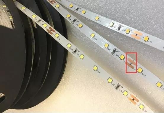 燈帶上每隔一小段就有一個剪刀標(biāo)識,代表這個地方可以剪斷。一般是多長剪一次呢?取決于燈帶的工作電壓。比如說這根歐普24V燈帶,是六顆珠一個剪刀口,一般每一段長度是10cm。像有的12V,是3顆珠一剪,大概5cm。